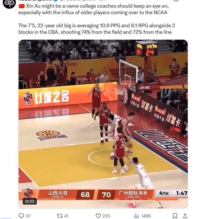 有美国媒体指出,有多所NCAA大学关注起了这位来自CBA的中锋,称赞徐昕有着不错的敏捷性和天赋。